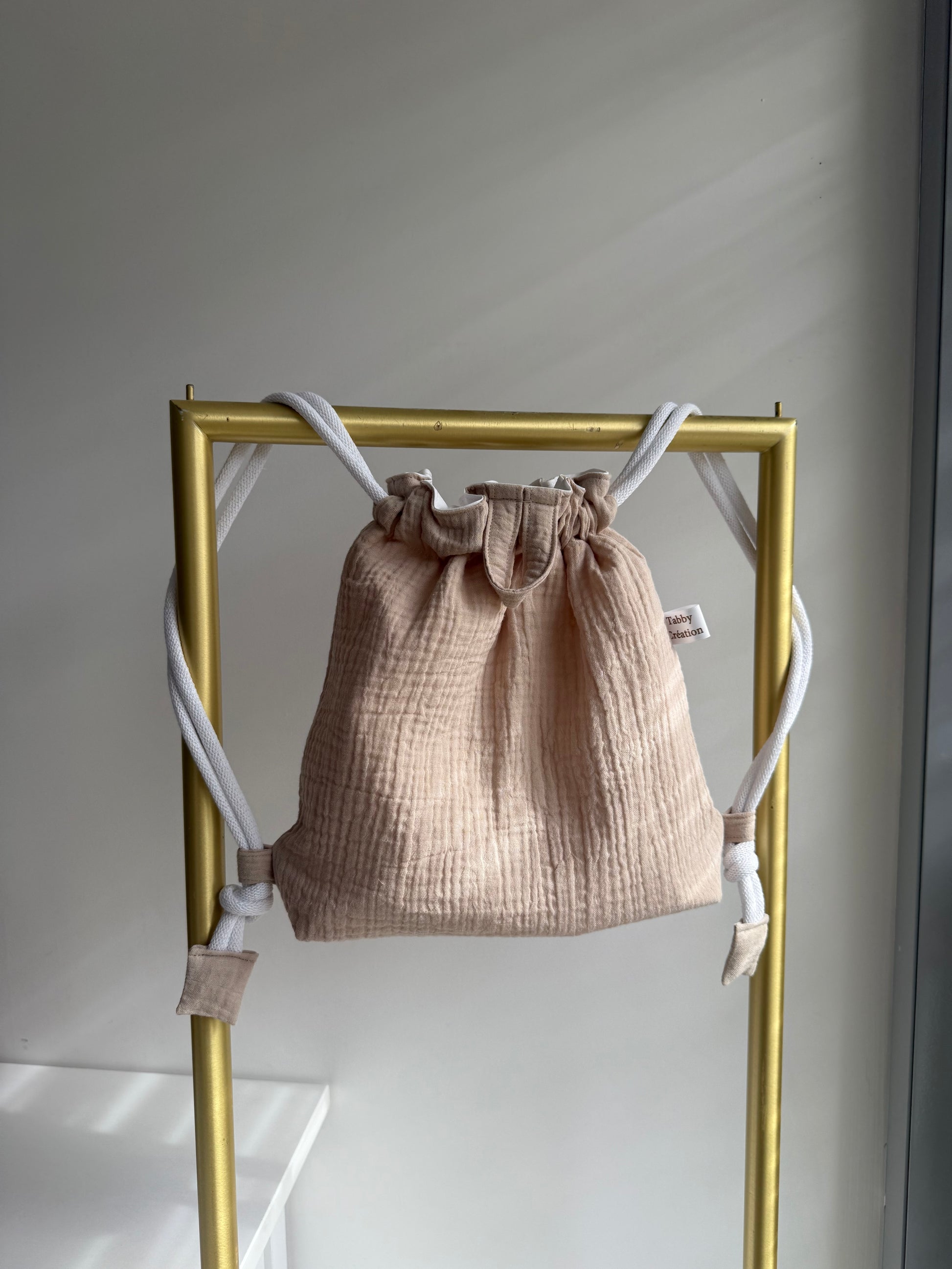 Un petit sac à dos facile à fermer avec ces cordons pour ranger les petites affaires du bébé pour crèche ou maternelle.